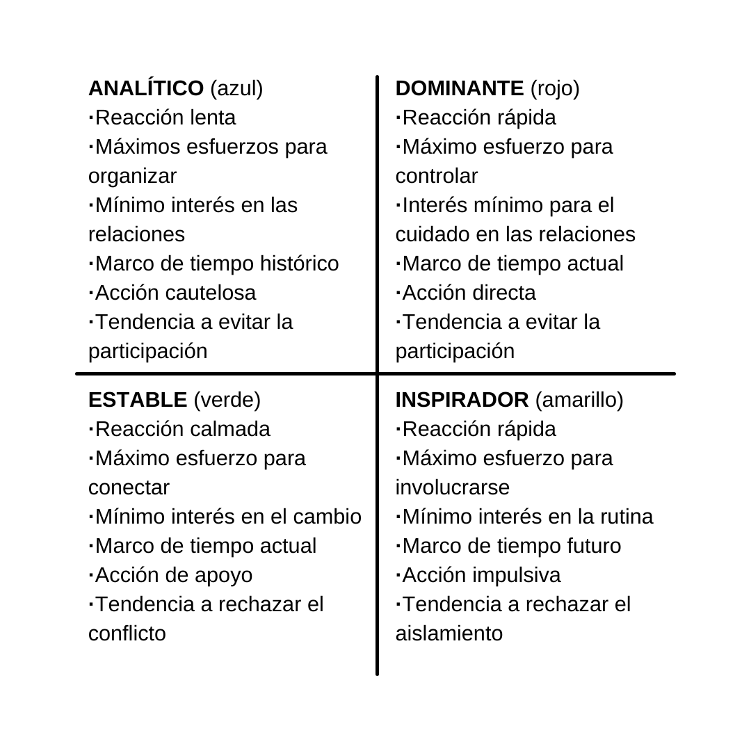 Las personas tipo rojo están enfocadas en la tarea y su inmediatez, disfrutan de los desafíos y pueden ser dominantes. Las del tipo amarillo tienden a estar más interesadas en las relaciones y en la velocidad en vez de las rutinas. El tipo más común es el verde: valoran la conexión y las relaciones, apoyan a su equipo, no les gustan los conflictos ni el cambio. Finalmente, las de tipo azul son analíticas, lentas para reaccionar, meticulosas y están orientadas a las tareas.